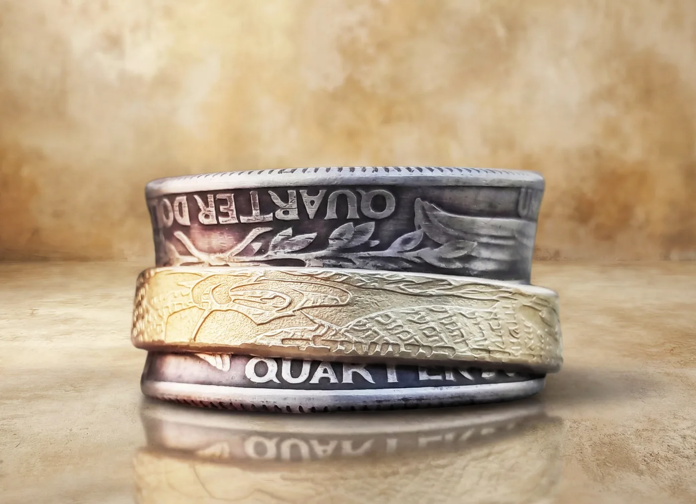 הטבעת על האצבע עשויה משתי מטבעות של Quarter (ארה"ב)