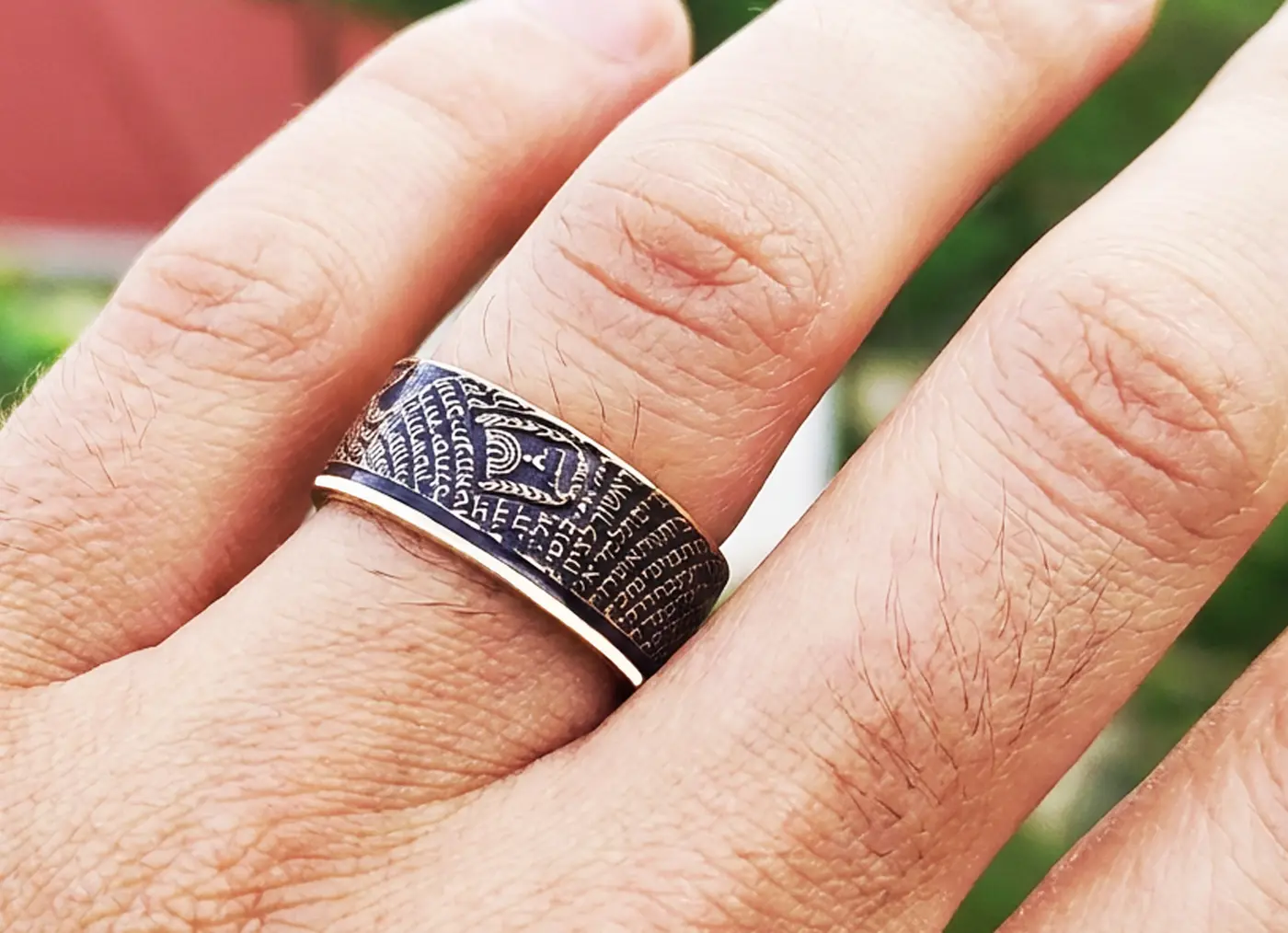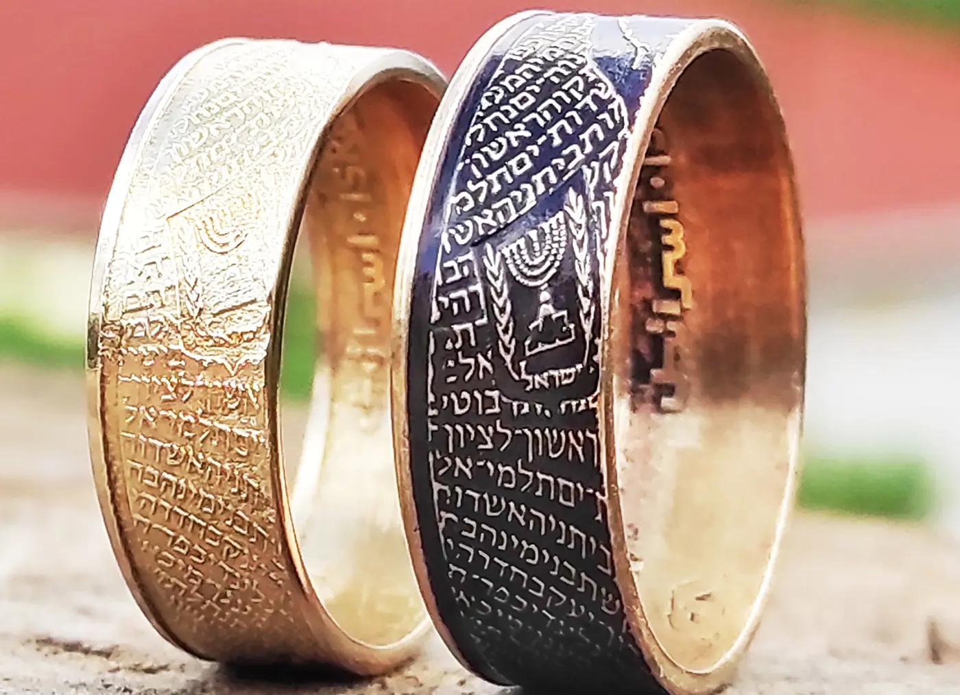 טבעת רוטשילד בצבע זהב או צבע זהב מושחר לבחירתכם, מעוטרת בסמל מדינת ישראל-מנורת שבעת הקנים ושמות של 44 ישובים שהקים הברון לפני הקמת מדינת ישראל. הטבעת מעוצבת בעבודת יד ממטבע חצי שקל עם דיוקנו של רוטשילד.