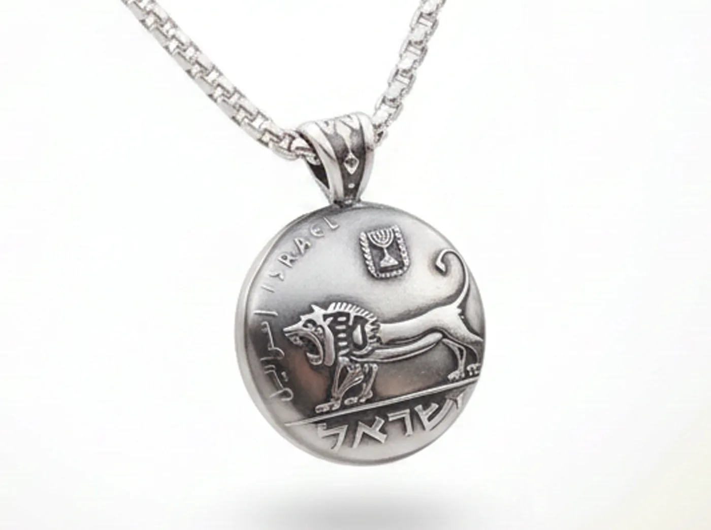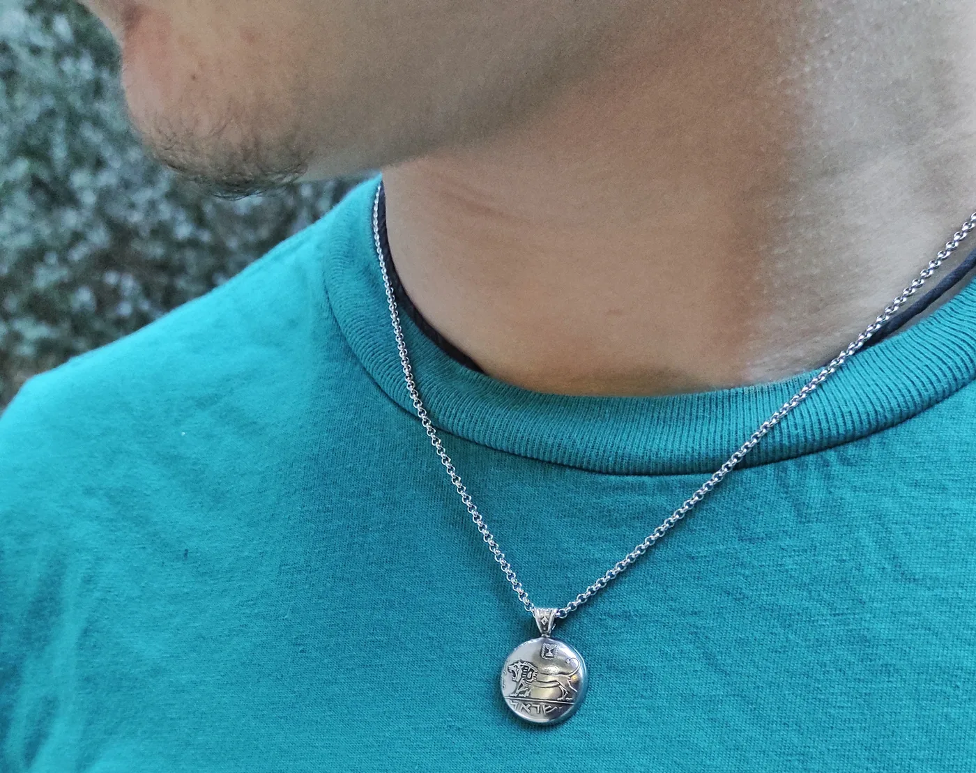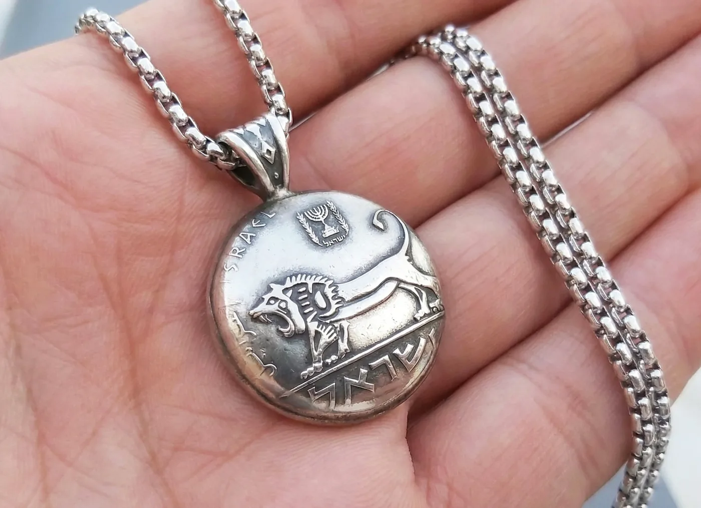 תליון בעבודת יד, עשוי ממטבע חצי שקל ישן - אריה יהודה.
