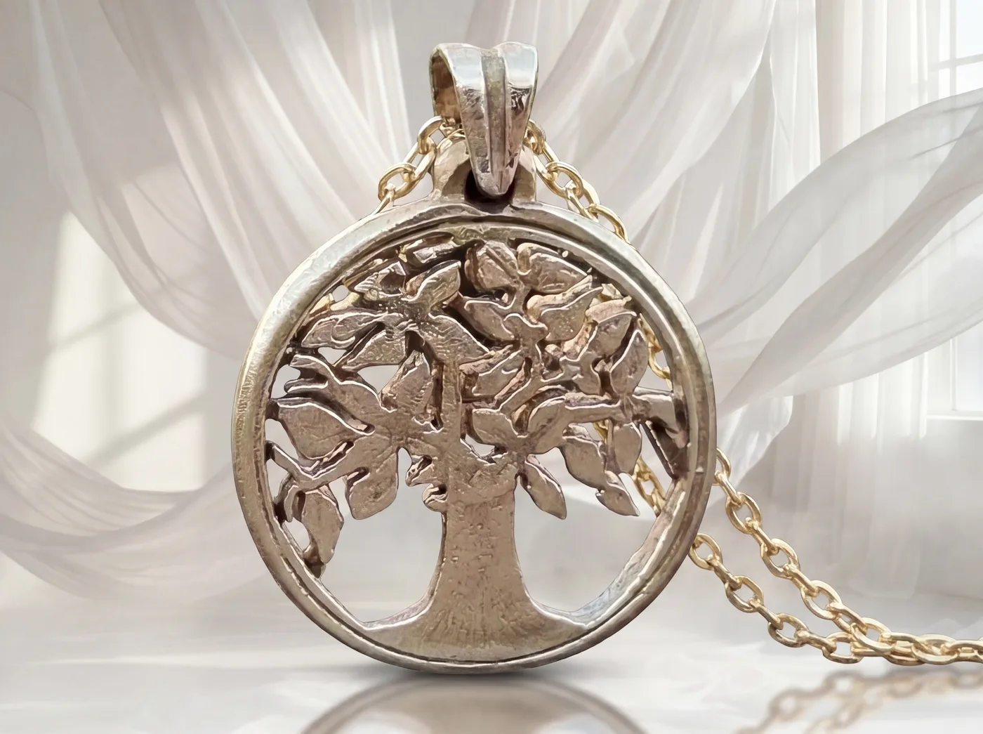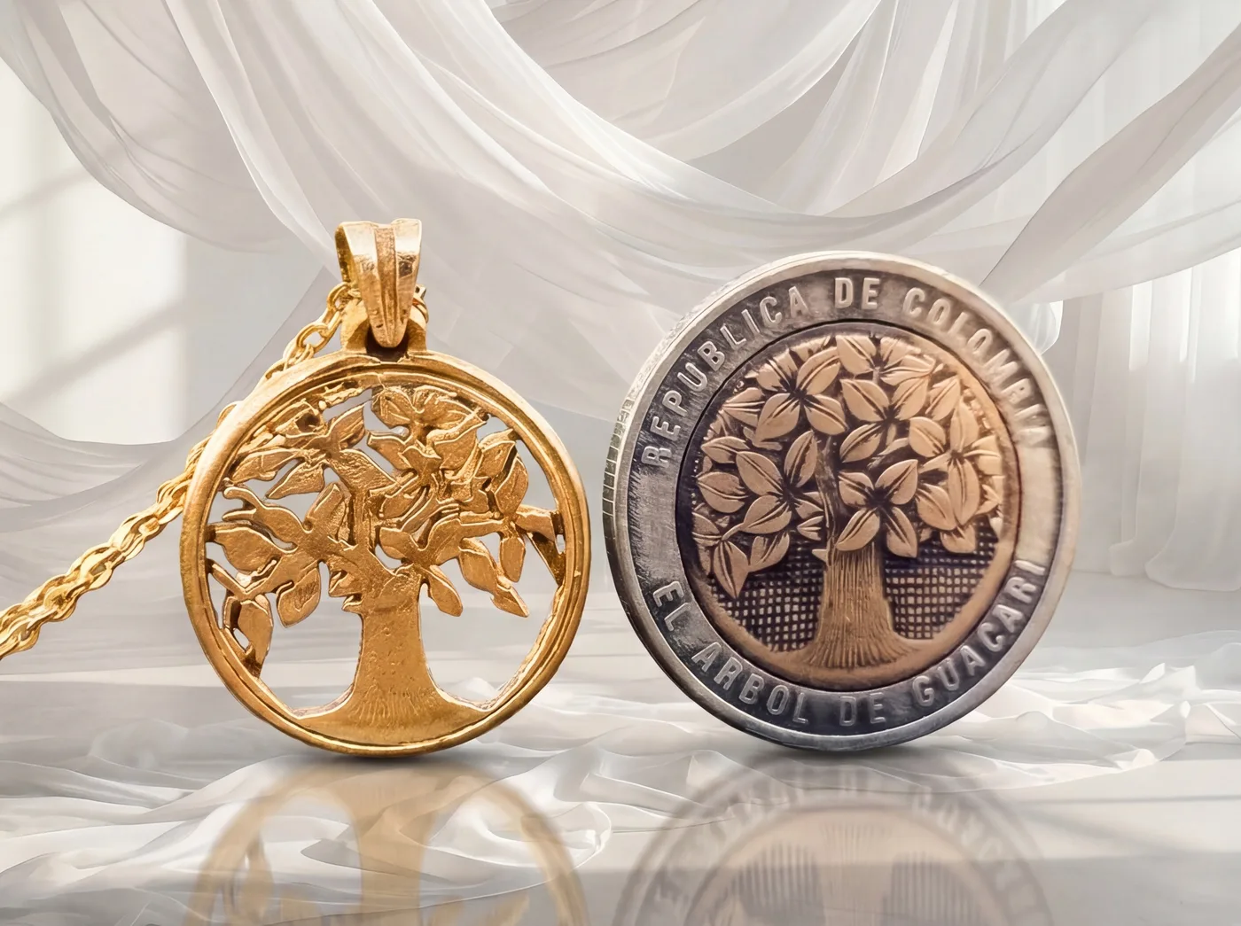 תליון בעבודת יד, עשוי ממטבע 500 פסוס, עץ החיים, קולומביה.