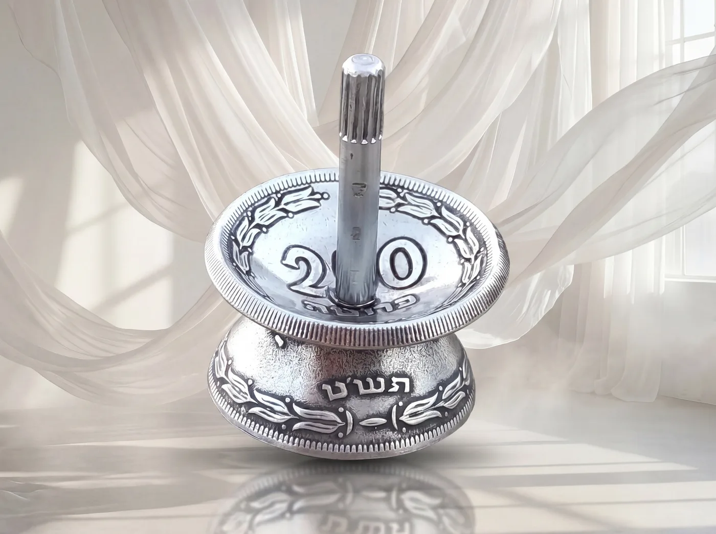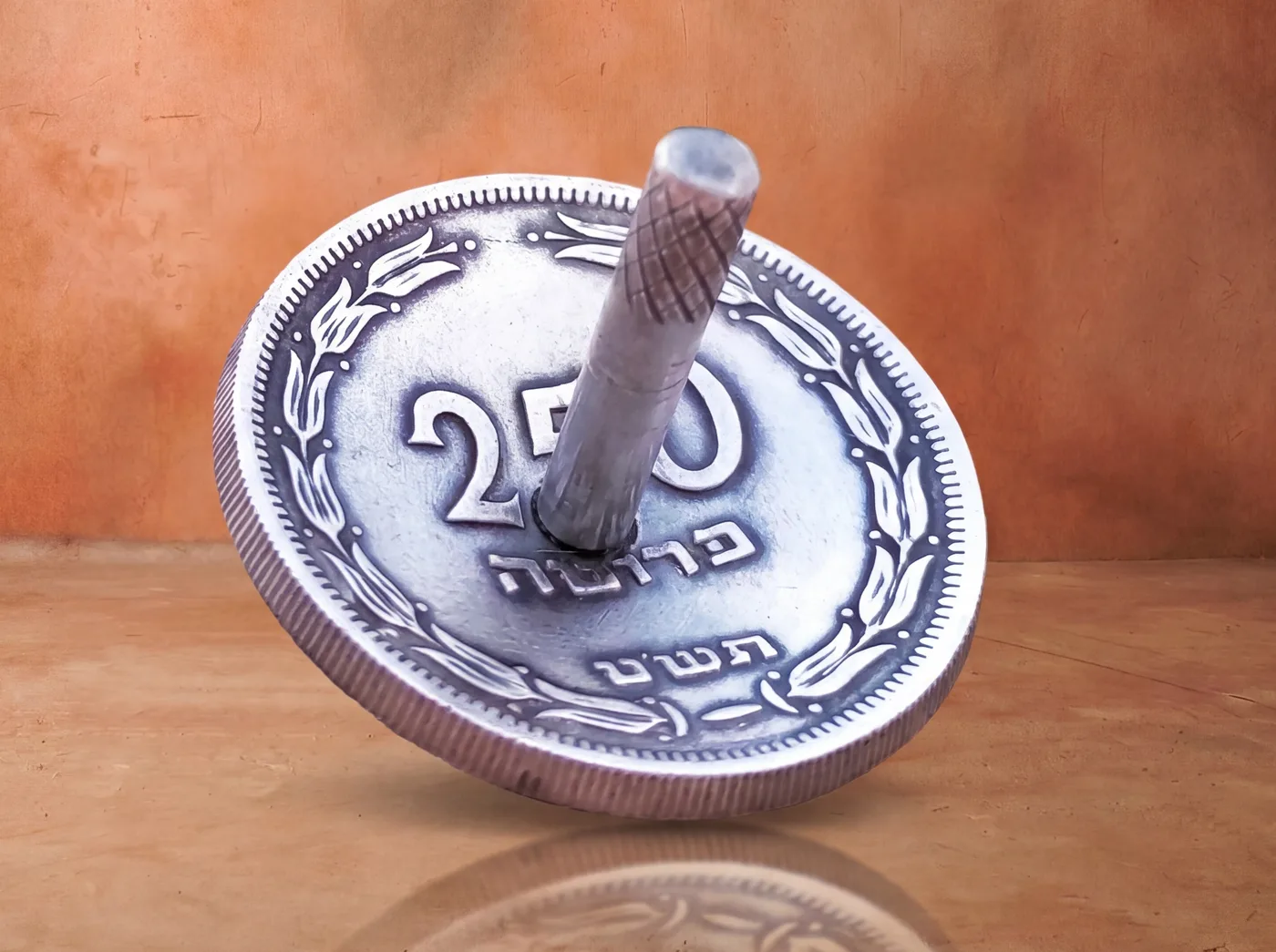 סביבון בעבודת יד, עשוי ממטבע 250 פרוטה - 1949, מהמטבעות הראשונים של ישראל.