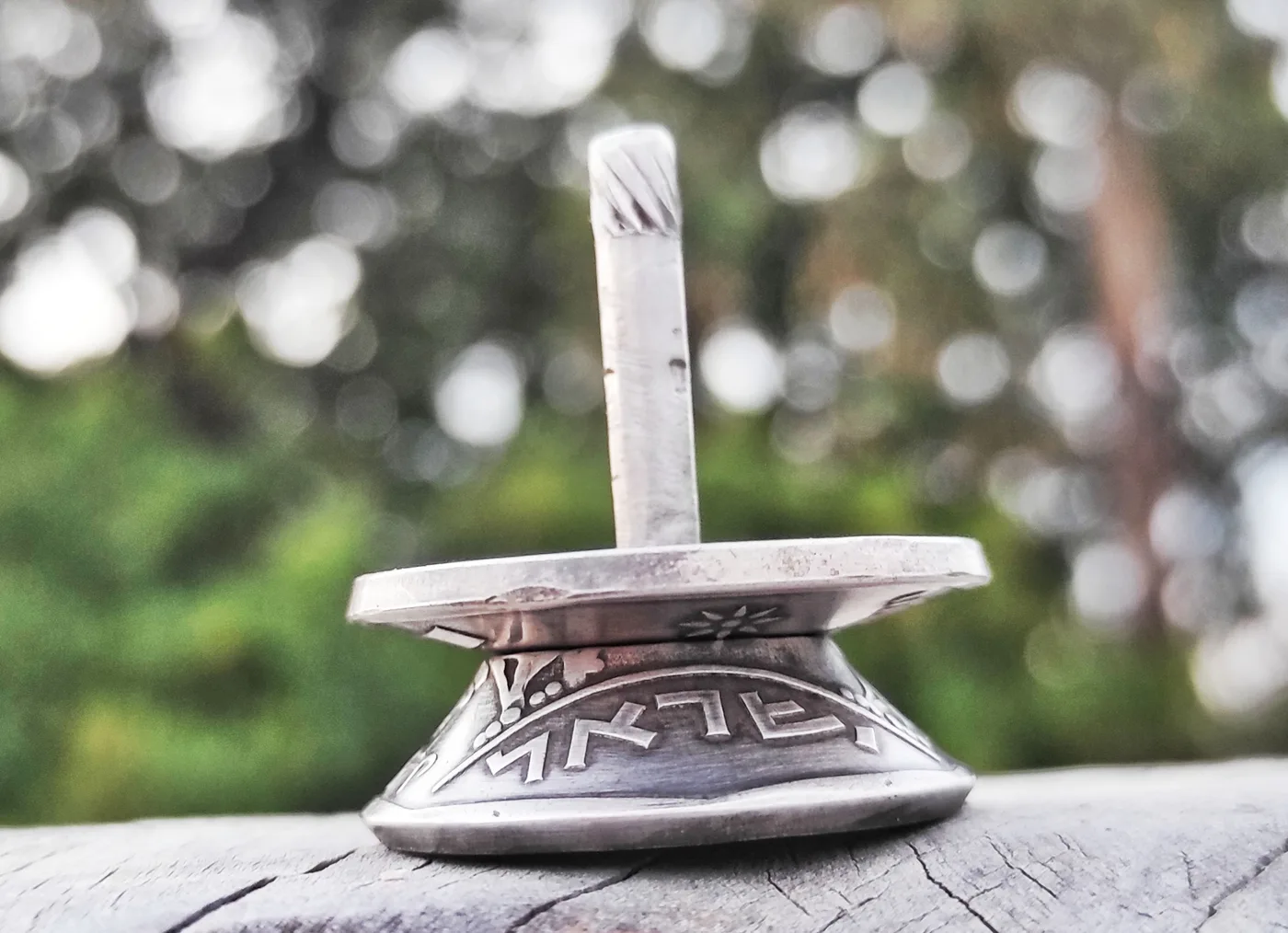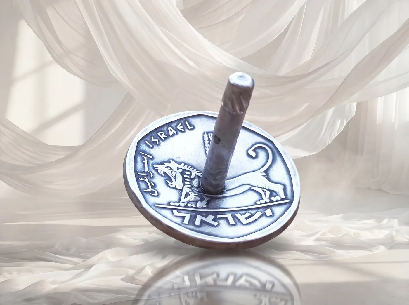 סביבון בעבודת יד, עשוי ממטבע 5 לירות אריה יהודה, שנות ה 70.